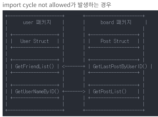 개요이전 import cycle not allowed 에러를 인터페이스를 활용해 해결https://dogfootman.com/9 [Go] import cycle not allowed - 예제개요import cycle not allowed가 발생하는 경우+---------------------+ +----------------------+| user 패키지 | | board 패키지 || | | || +-----------------+ | | +------------------+ || | User Struct | | | | Post Struct | || +-----------------+ |dogfootman.com    1. 프로젝트 구조/dependency2│├── main.go├── user│ └─..
